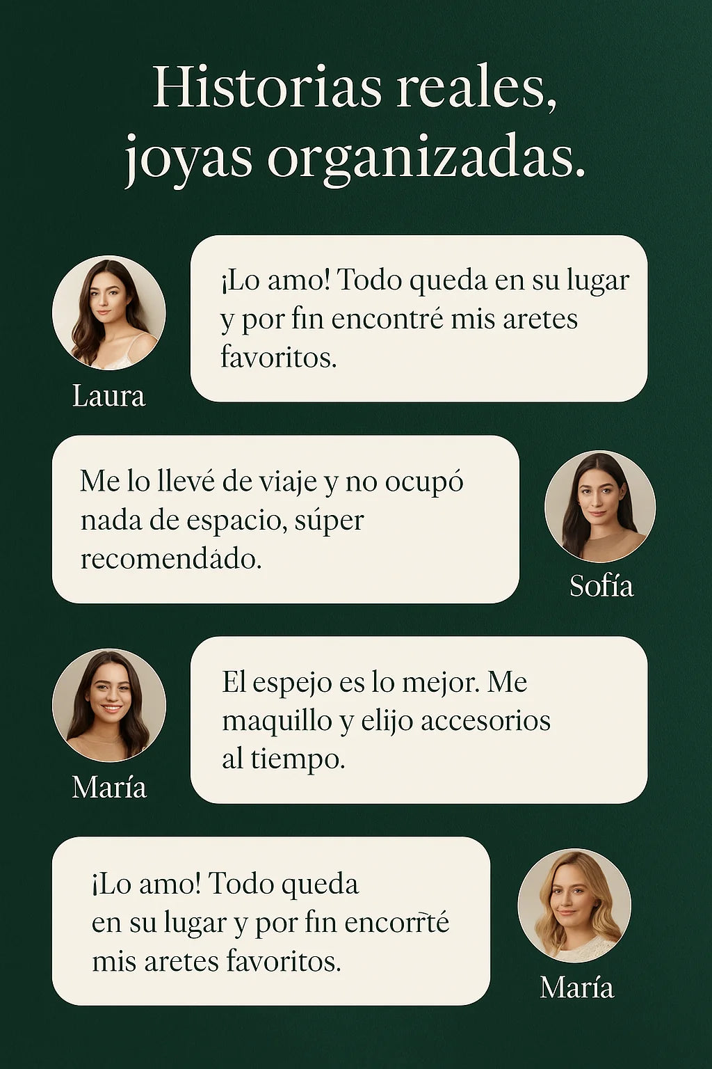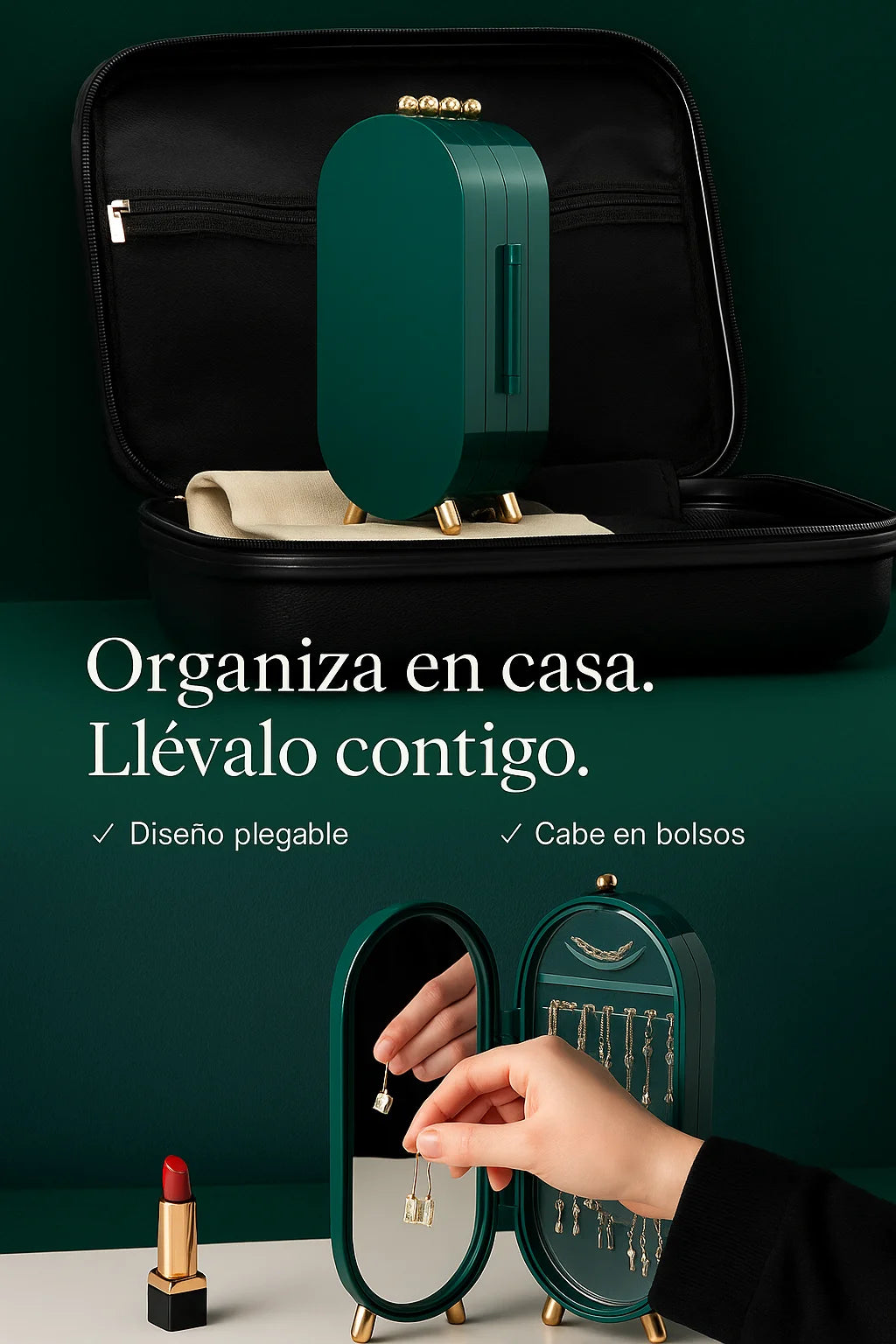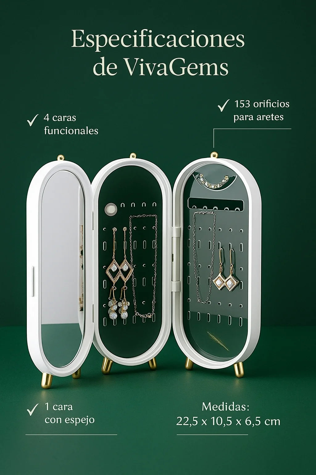 VivaGems tiene capacidad para organizar hasta 153 pares de aretes, 21 collares y otros accesorios como anillos y cadenas gracias a sus ranuras tipo U. Además, una de sus caras incluye un espejo para facilitar su uso diario.