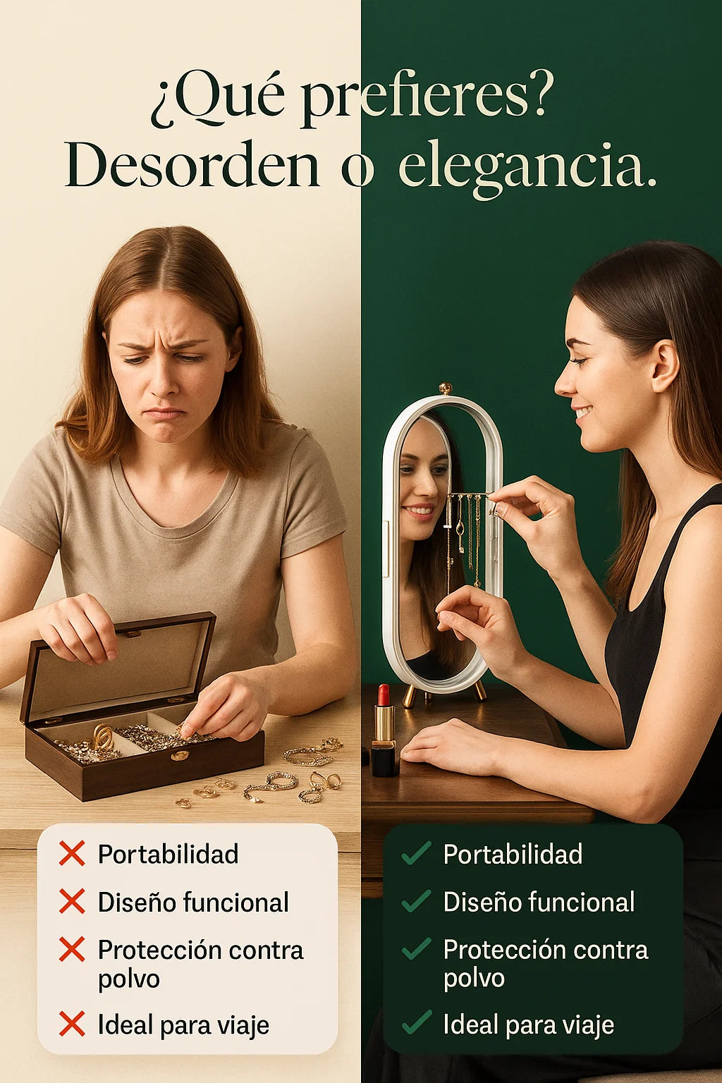 Está fabricado con ABS de alta calidad y una base metálica estable, lo que lo hace resistente, duradero y perfecto para proteger tus joyas del polvo y la humedad.