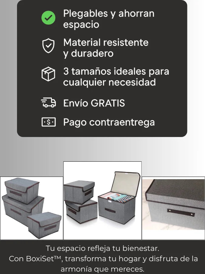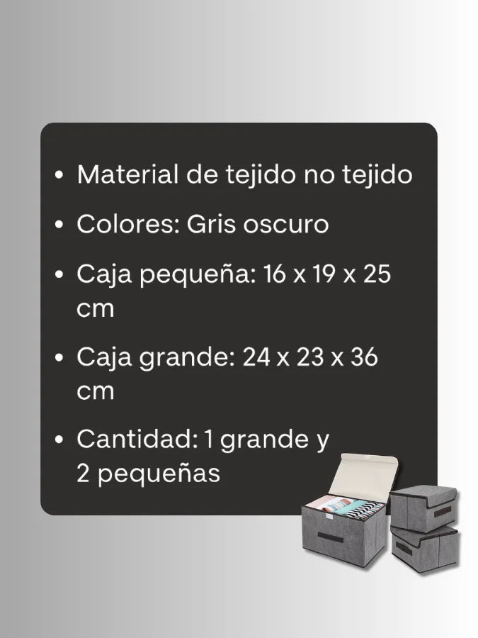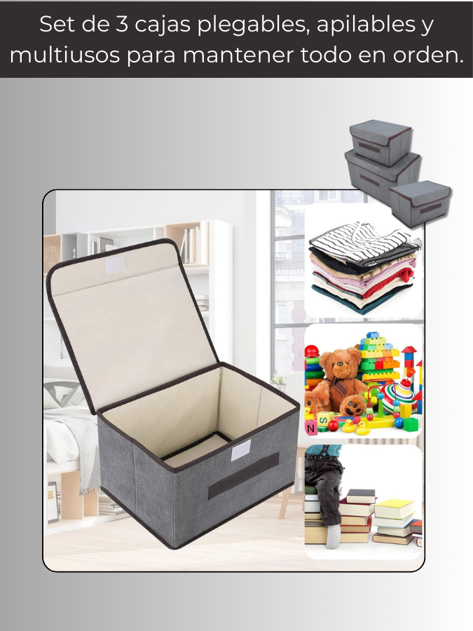El set incluye 3 cajas plegables multiusos: 1 grande y 2 pequeñas.