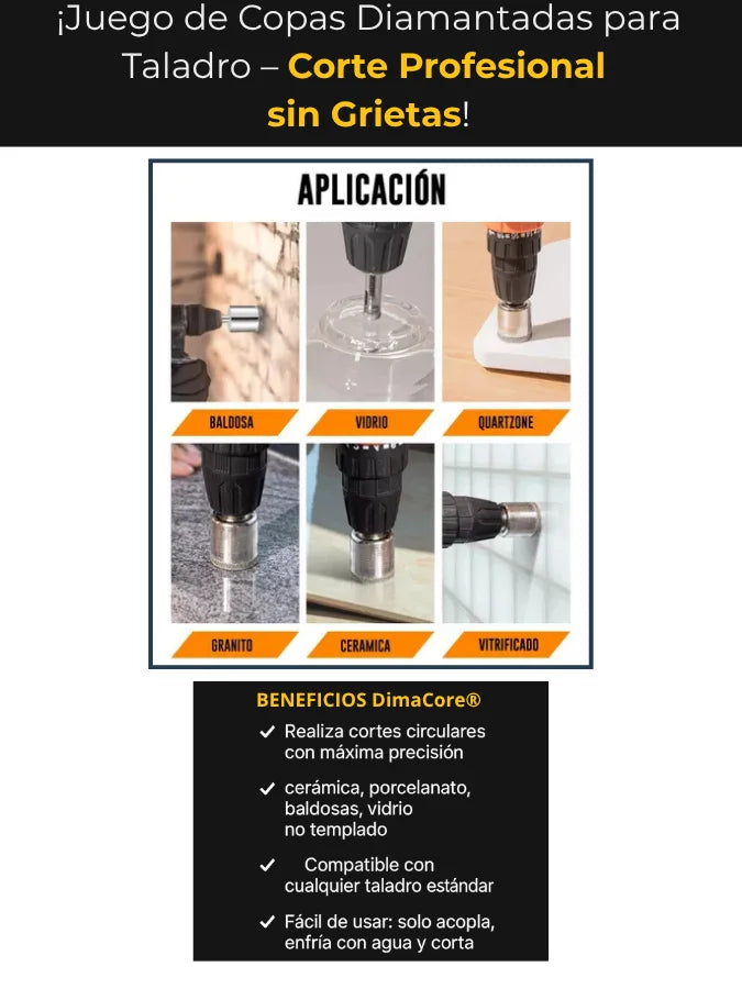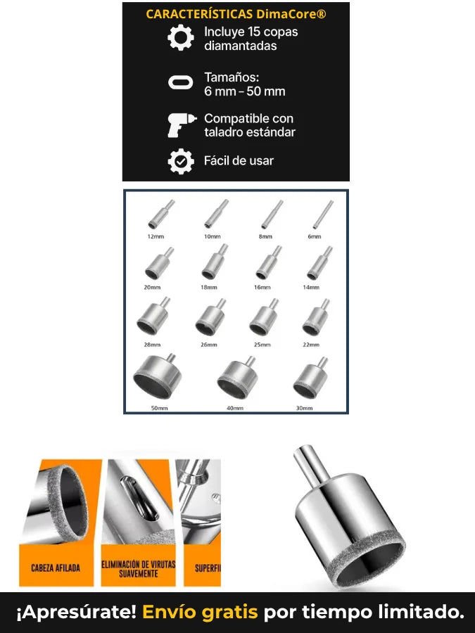 Sí, todas las copas DimaCore™ funcionan con taladros eléctricos convencionales. No necesitas herramientas adicionales ni adaptadores.