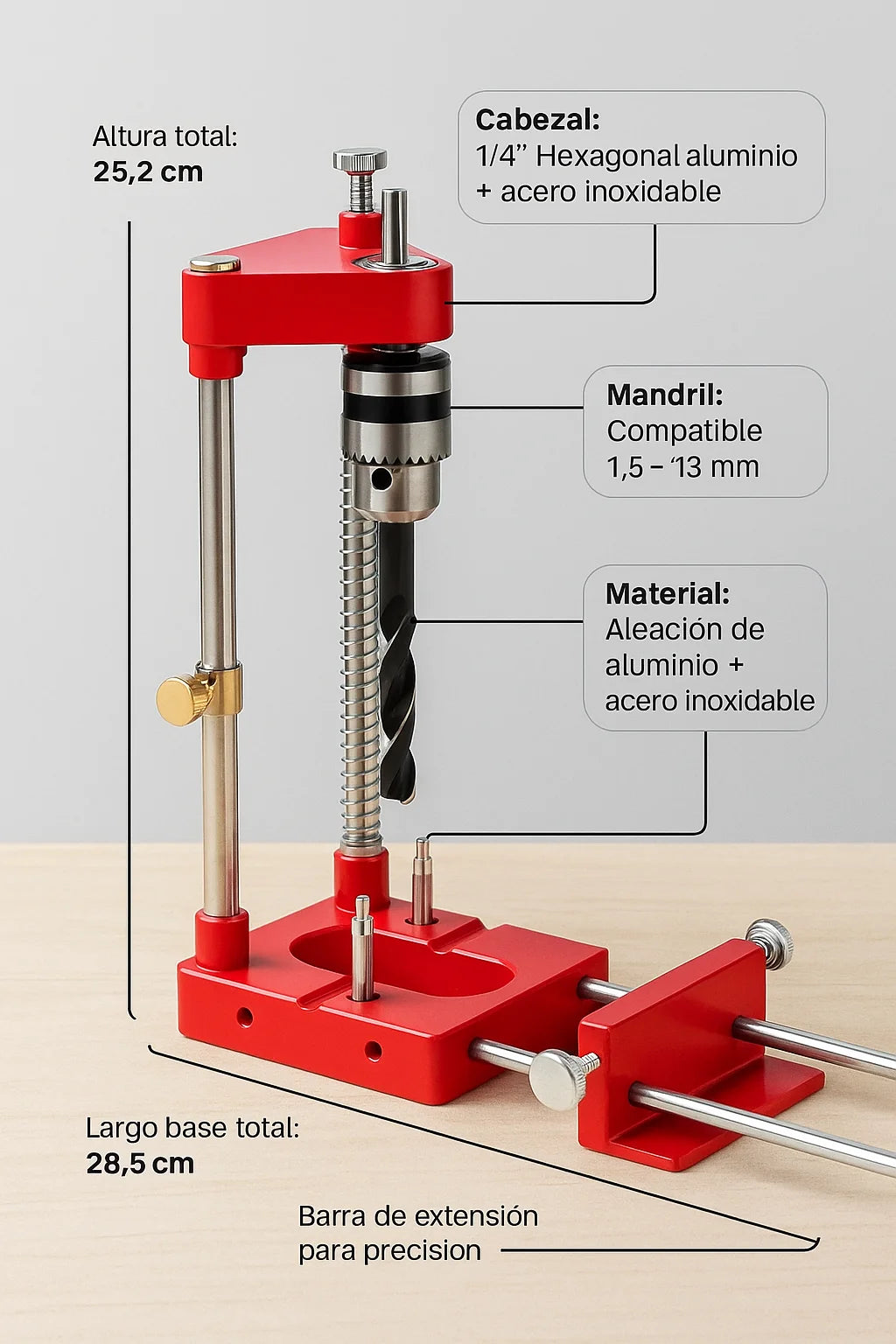 No. Solo debes fijar tu taladro y ajustar la base. No requiere accesorios adicionales.
