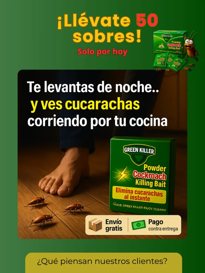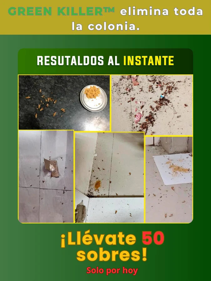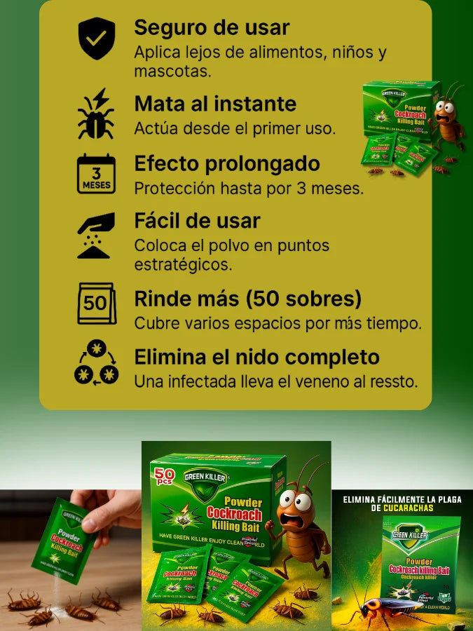 Desde el primer uso comienza a eliminar cucarachas. En pocas horas verás resultados visibles y, gracias a su efecto contagioso, el veneno llega hasta el nido.