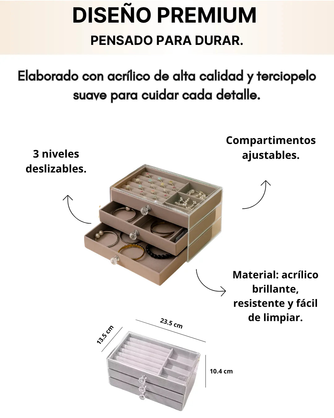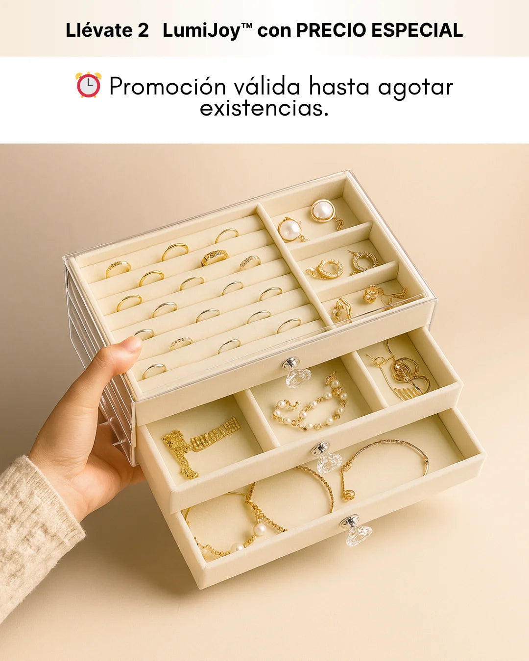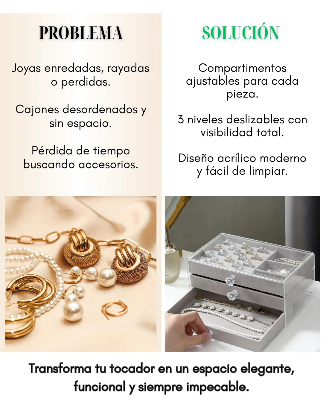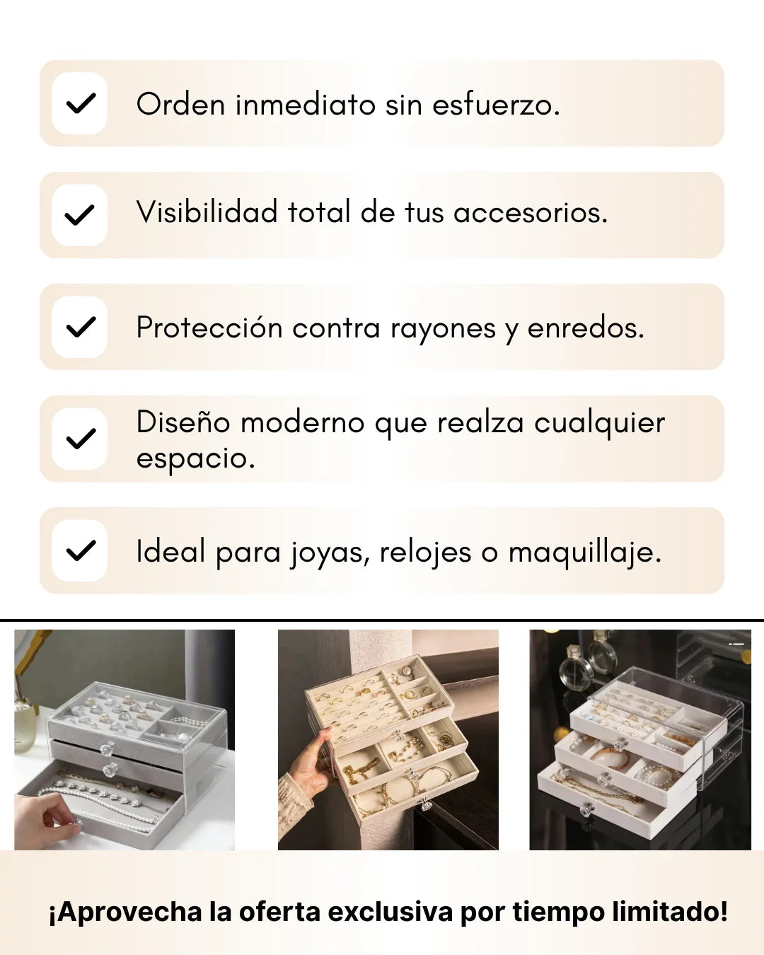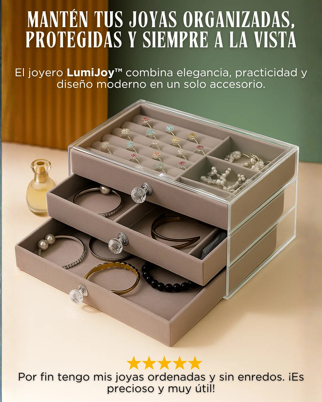 Sí, sus compartimentos ajustables permiten organizar desde anillos hasta relojes.