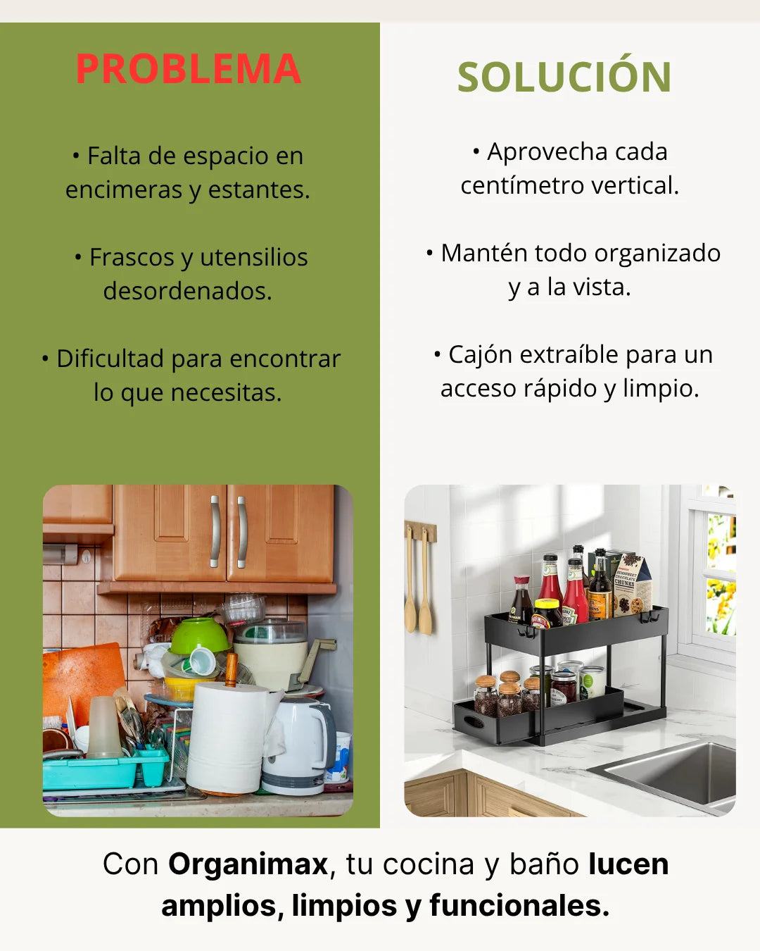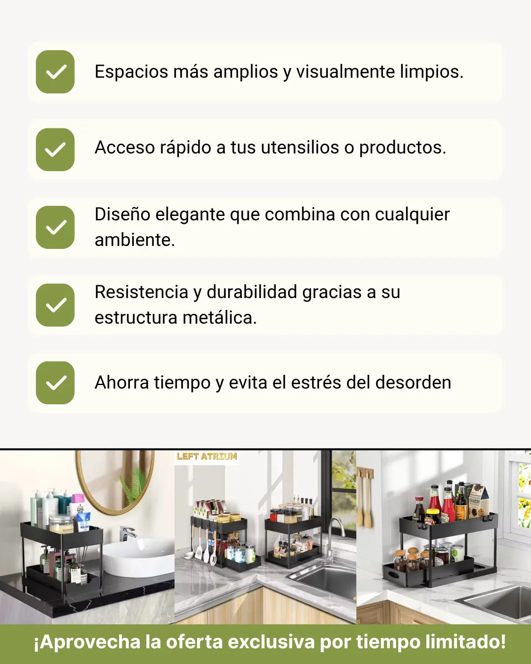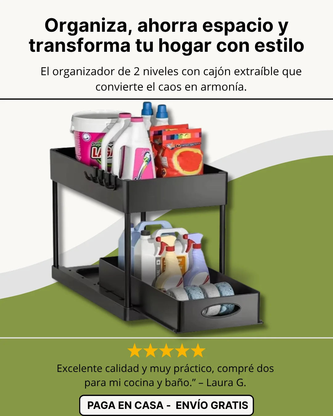 Sí, incluye ganchos laterales para colgar utensilios o toallas.