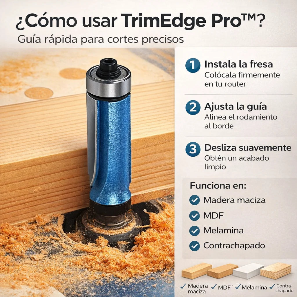 ⭐⭐⭐⭐⭐ Antes perdía tiempo corrigiendo bordes, pero con esta fresa el trabajo queda bien desde la primera pasada. La he usado en MDF y va perfecta. — Luis F., Cali