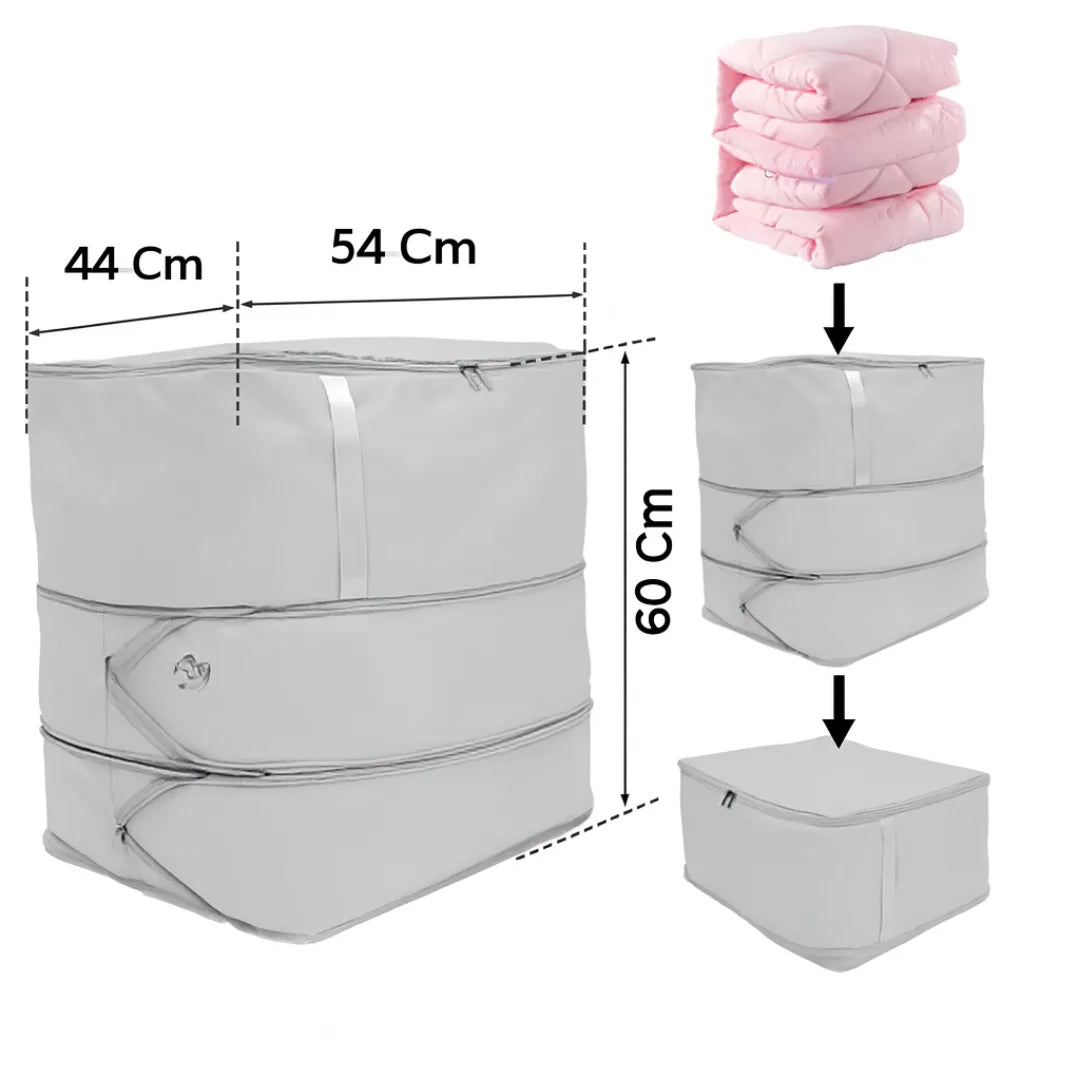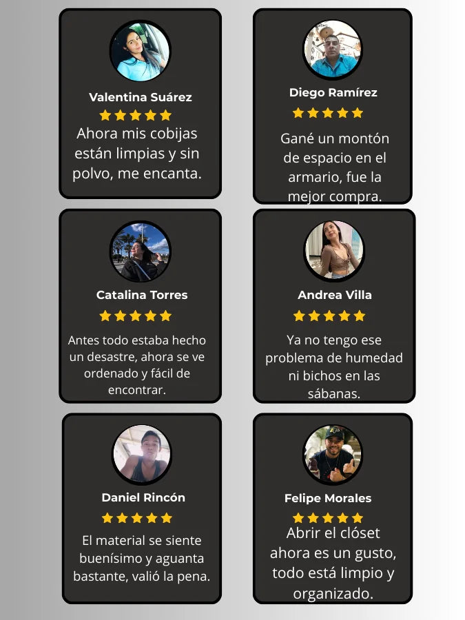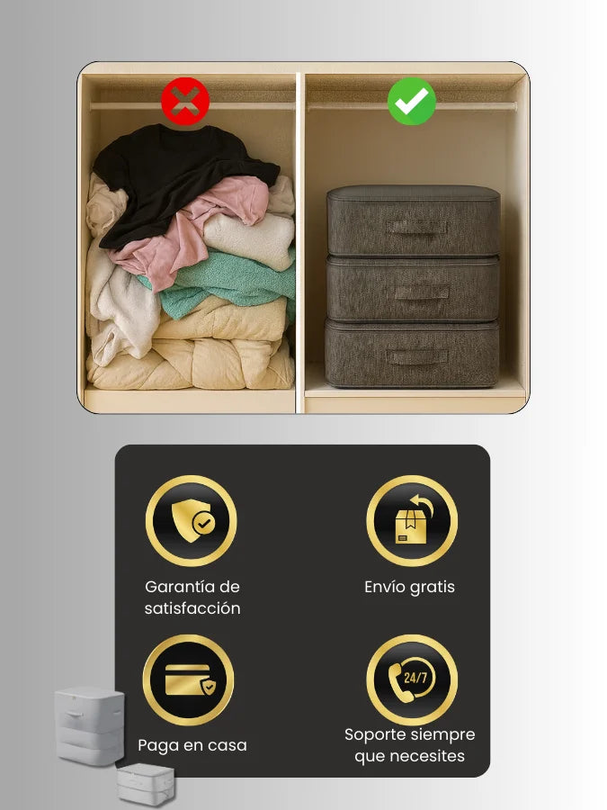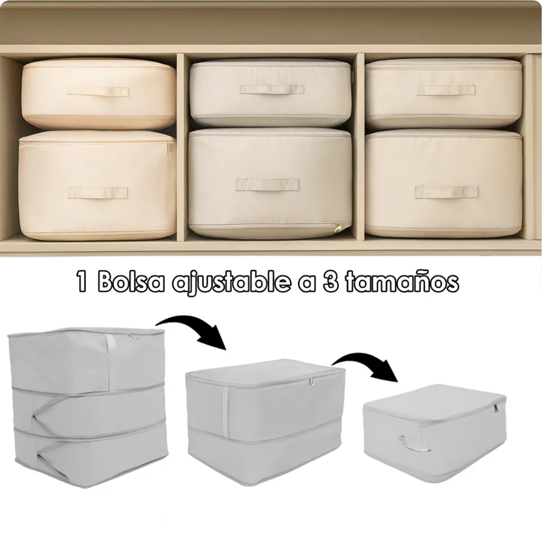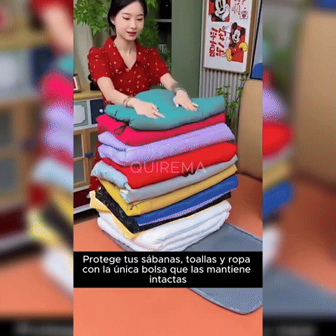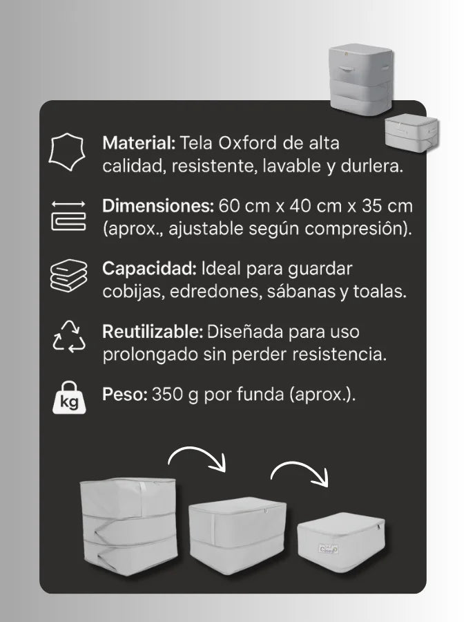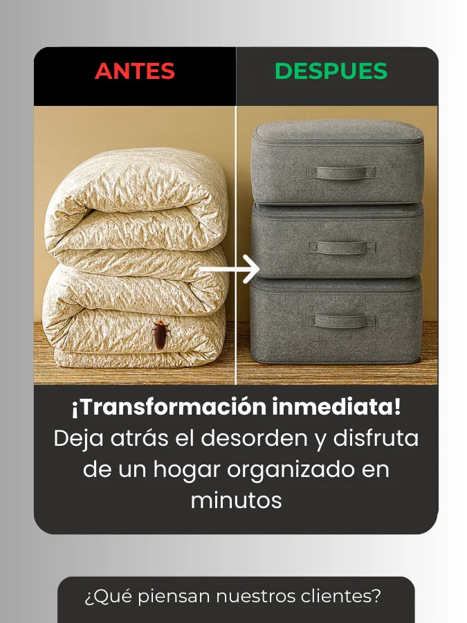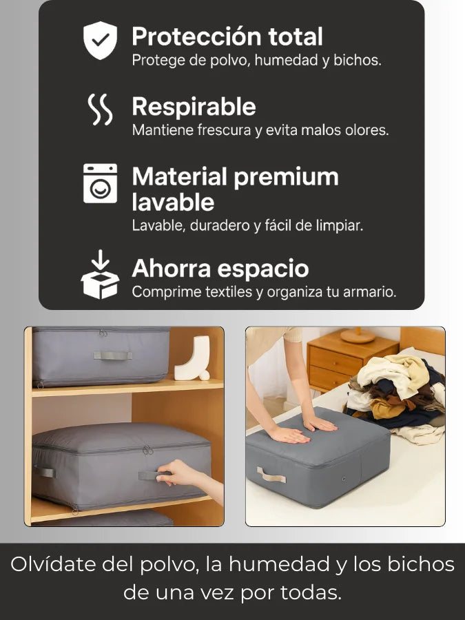 Puedes guardar cobijas, edredones, sábanas, toallas, ropa de temporada y textiles voluminosos. Son ideales para mantener todo protegido, limpio y organizado.
