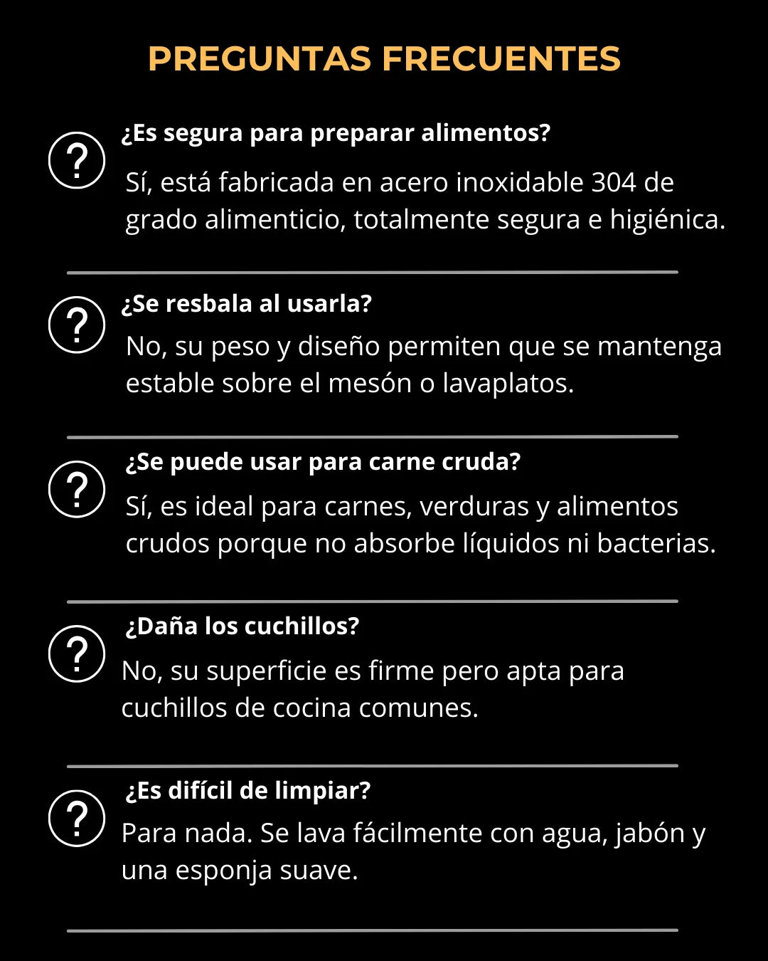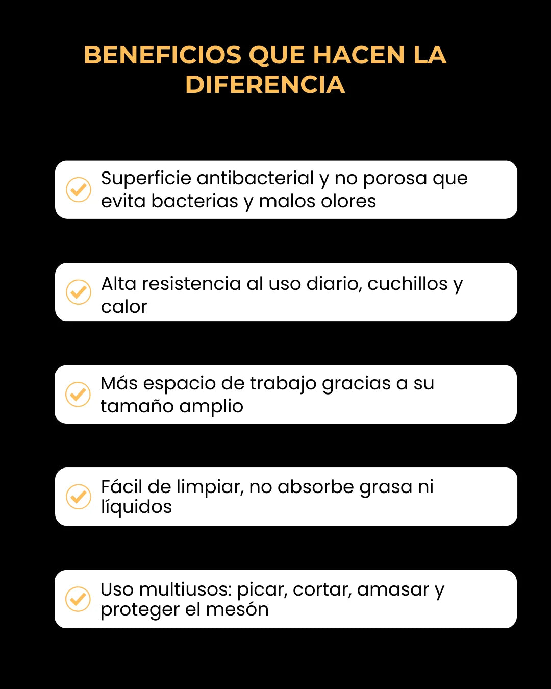 Te ofrece una superficie higiénica, resistente y amplia, ideal para cortar, picar, amasar o preparar alimentos con total comodidad.